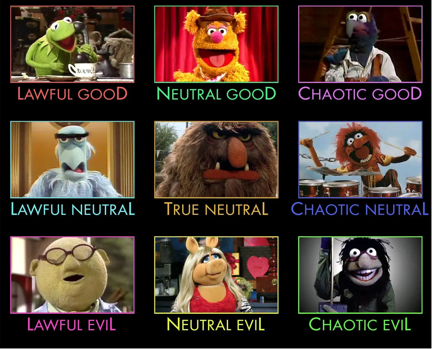 It was a grid of Muppets. Many Muppets. Nine Muppets plotted across two axes: Lawful → Chaotic and Good → Evil.
